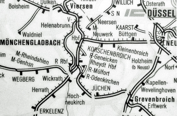 Een kaart van de sporen in de omgeving van Herrath, Wickrath, Rheydt Gbf en Rheydt Hbf.