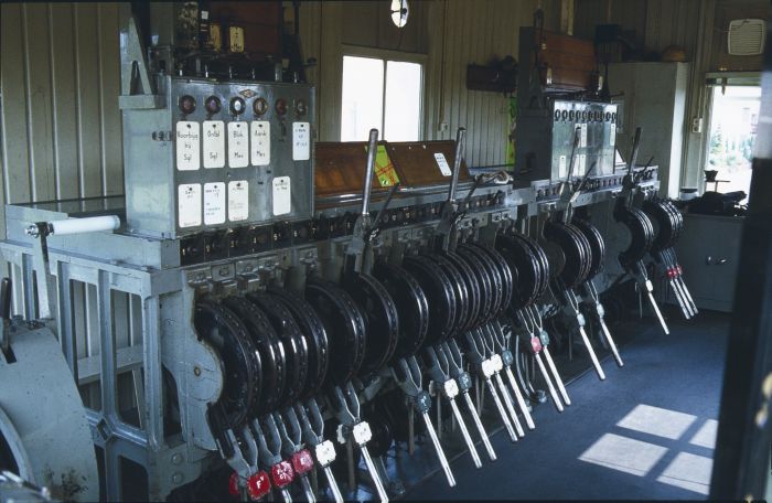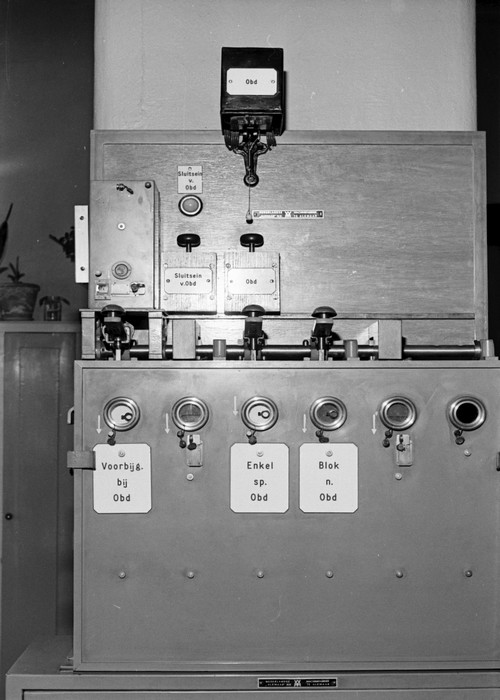 Het bloktoestel van post T Sittard. Op de vrije baan is al automatisch blokstelsel en zitten er daarom alleen richting Roermind, Heerlen en Maastricht elk enkel een blokvenster.