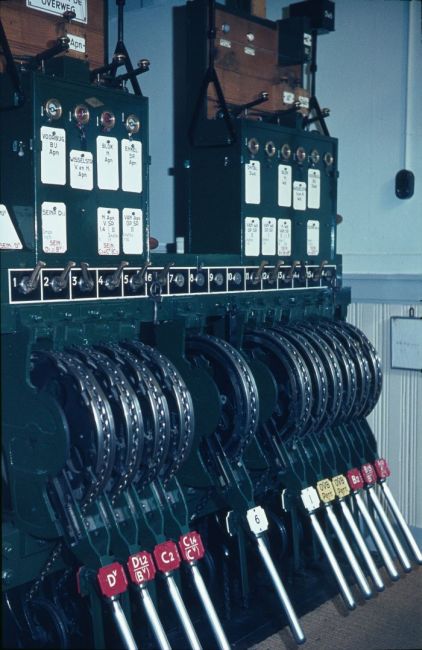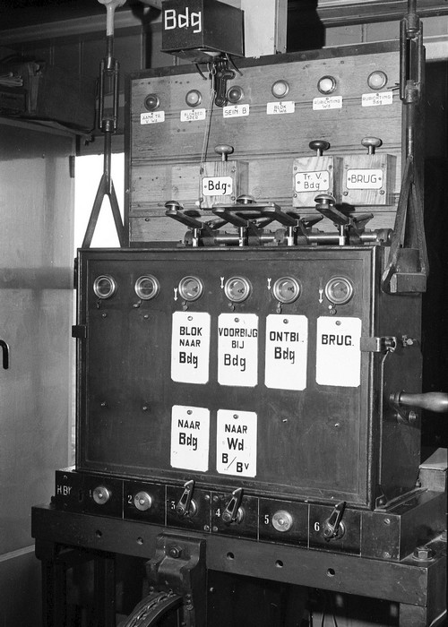 Het bloktoestel in de brugpost Dubbele Wierickebrug. Jaren zestig.