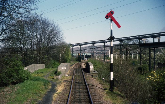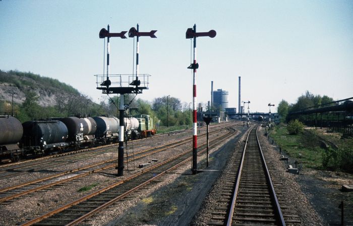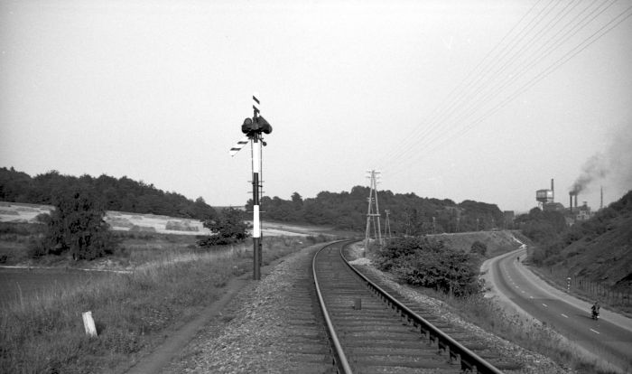 Het inrijsein van Haanrade zijde Schaesberg. De drie vertakkingsseinen links waren voor het linkse enkelspoor van Schaesberg. De rechter paal voor de enkelsporige aansluiting van de Mijn Laura jaren vijftig.