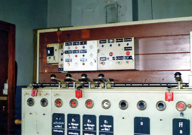 Een detail van het Dr toestel in stellwerk Kf d.d. 7 mei 1992. Op de sporen richting Kranenburg zijn gevaarknoppen aangebracht. |