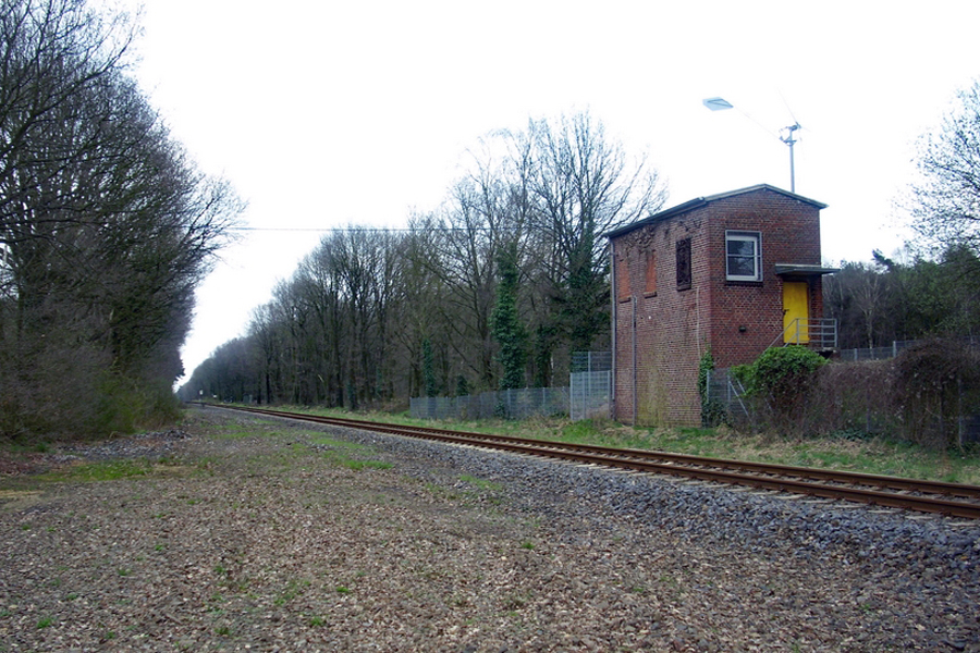 Het perron en het haltegebouw met het voorsein van het inrijsein van Mönchengladbach - Rheindahlen.