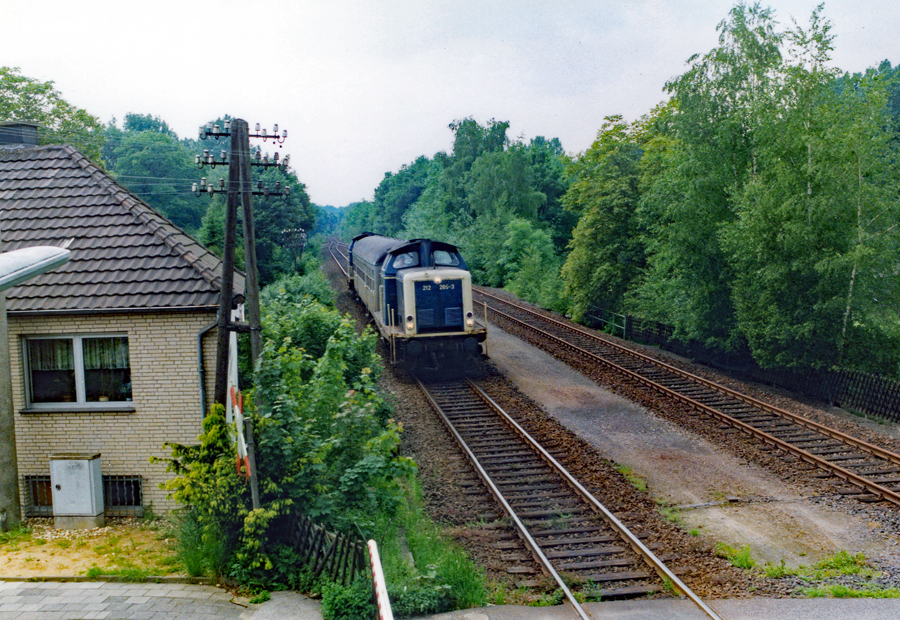 De passage van locomotief DB 211 234-0 met een goederentrein Dalheim - Reydt Gbf (links) en de ETA accutreinstellen 515 738 en 515 625 (rechts) d.d. 29 juli 1982.