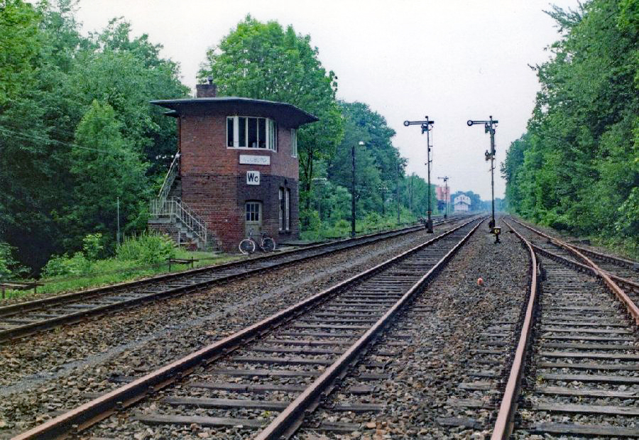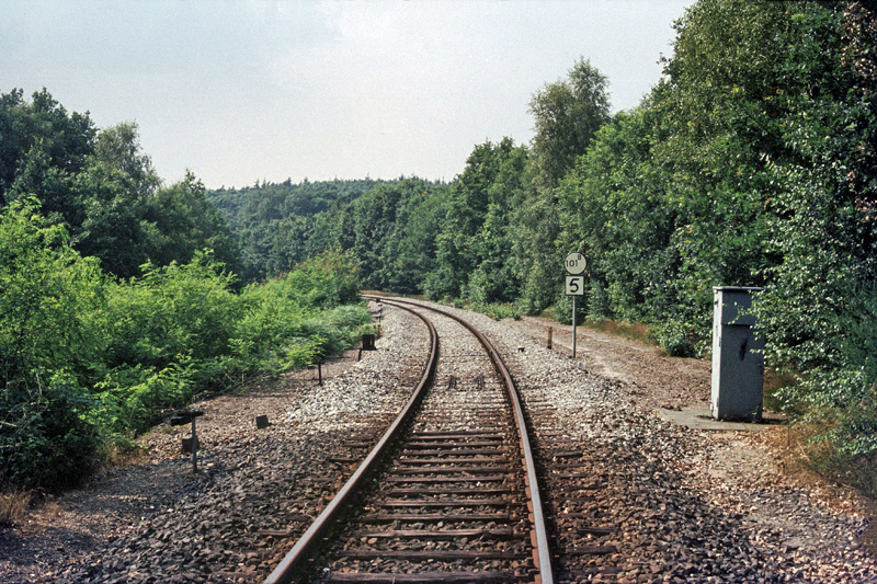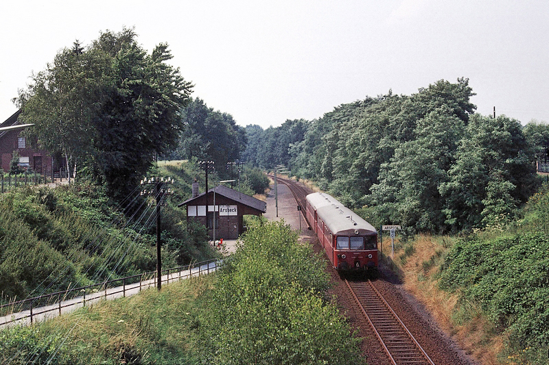 Het vertrek van een ETA accutreinstel richting Wegberg d.d. 29 juli 1982. (Foto: Roelof Hamoen) (links) en de halte Arsbeck in westelijke richting gezien vanaf het viaduct in de Heiderstraße (rechts).
