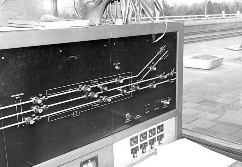Detail van het AR-toestel van Uitgeest met twee kruiswissels en stop-doorschakelaars voor de overwegen bij de haltes op de vrije baan.