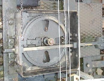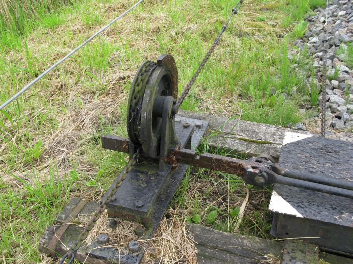 Wissel 24 met links de steller en rechts het enkel grendel. (voor beide standen één enkel grendel.) (Foto J. Notenboom)