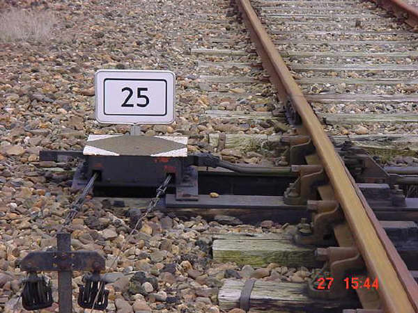 Wissel 26 te Simpelveld. Links de wisselsteller en rechts het grendel. De witte magneet op de voorgrond is nog iets uit het verleden van de Duitse Indusi. (foto: G. van Dalen)