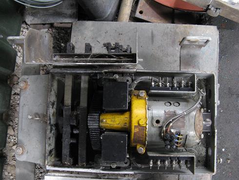Een elektrische wisselsteller zonder deksel. De twee linkse stangen zijn voor het omleggen van het wissel de andere twee voor de standcontrole. (Foto J. Notenboom)