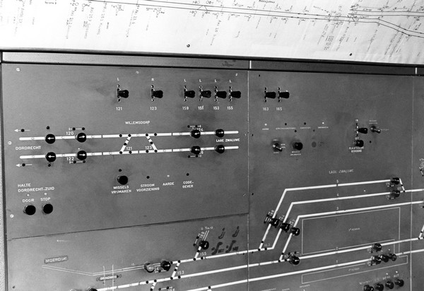 Een tekening van het tableau van Abcoude met daarop de verschillende knoppen en signaleringen.