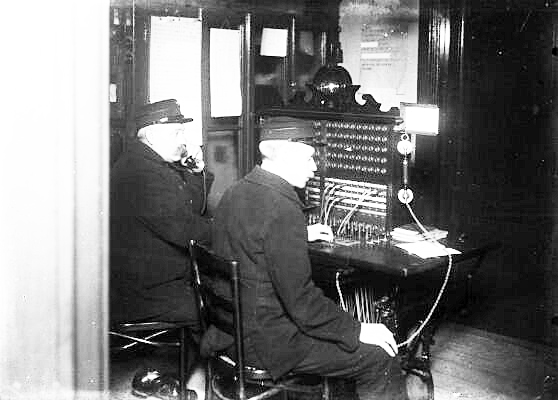 Twee spoorwegbeamten bij de centrale telefoon van post T Utrecht. (bron: Utrechts archief) (links)  en een meerlijnig toestel met lijnschakelaars en bel boven op het toestel. Goed voor tien lijnen.(rechts).