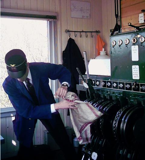 Vervolgens legt hij het wisselstraatkrukje om zodat het seinkrukje weer teruggelegd kan worden. Hierna legt hij het wisselstraatkrukje weer terug en geeft een weksein waarna hij het venster "Blok naar Simpelveld" terug geeft aan Post II te Simpelveld.