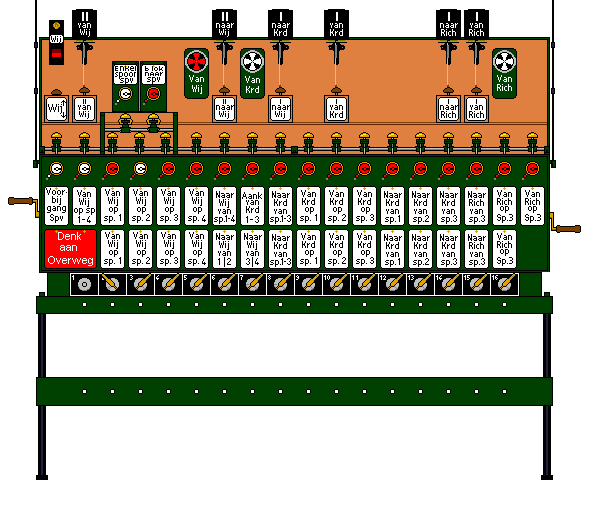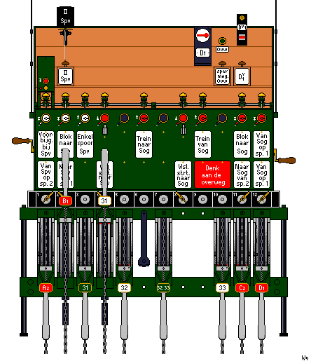 - De treindienstleider breekt zijn rijweg verder af door het wissel 31 weer normaal te leggen. Zijn taak zit er voorlopig op. Het toestel is bijna weer in de normale stand. Alleen het enkelspoorvenster is rood i.p.v. wit ten teken dat er een trein richting Simpelveld onderweg is.