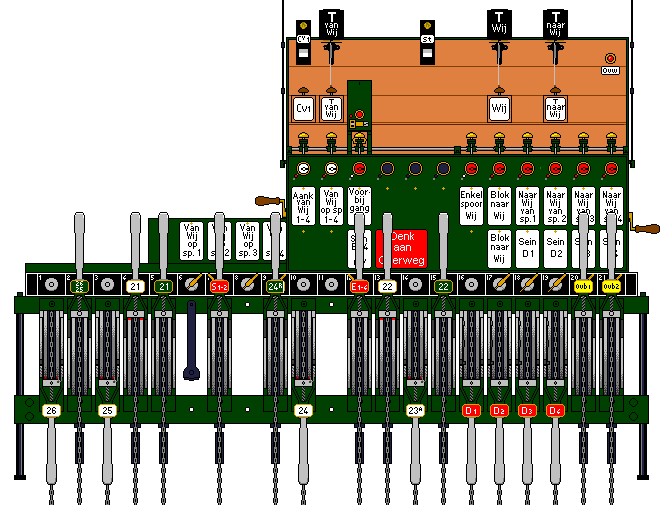 - Post II begint met het instellen van de rijweg. Officieel naar de trein toe. Dus de verste wissels als allereerste. Hij begin met het omleggen van de handels. Dat zal zijn in de volgorde: Wissel 21, 22 en de bijbehorende grendels. vervolgens de grendels van wissel 24 en 25/26. Hierna is de wisselstraat ingesteld. Deze wordt vergrendeld door het omleggen van het krukje "van Wijlre op spoor 2" in veld 7 en het geven van het venster "van Wijlre op spoor 1, 2, 3 of 4"