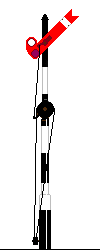 |  | Een zwart-witte paal met een rode aan het uiteinde V-vormig ingesneden seinarm met een witte loodrechte streep. De seinarm staat waterpas. | Een paars licht. | Stop voor rangeerbewegingen. |