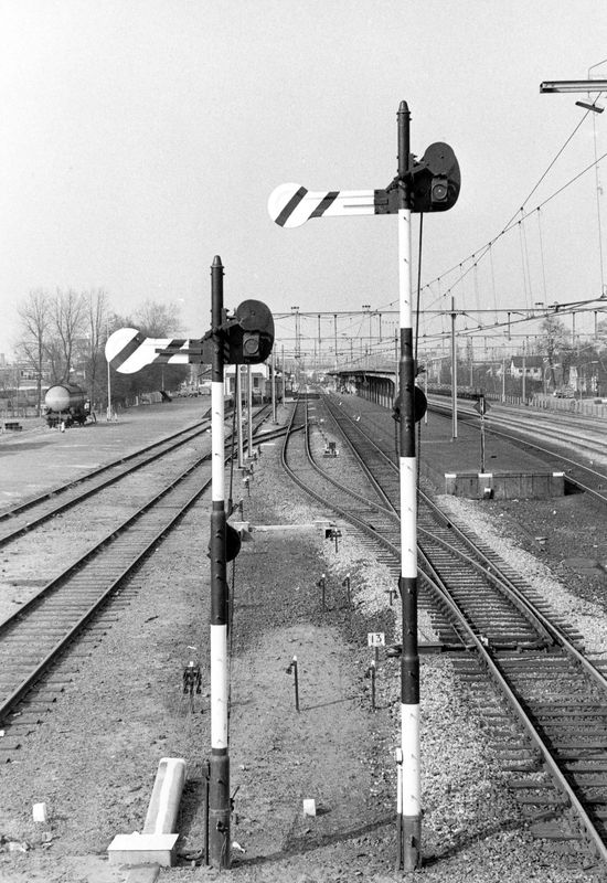 De aankomst van de intercity 549 op spoor III vanuit post I (links) en de achterzijde van de seinen B1 en B2 gezien vanuit post I (rechts) d.d. 10 april 1976.