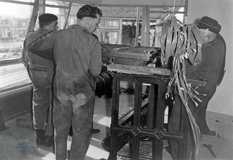 NS-medewerkers die doende zijn de linealenkast van het toestel uit de oude post over te brengen naar de nieuwe post.
