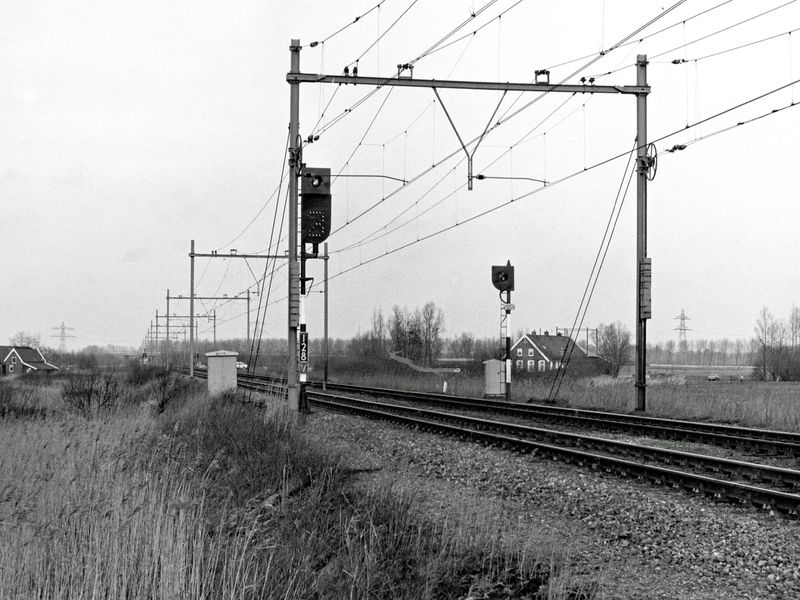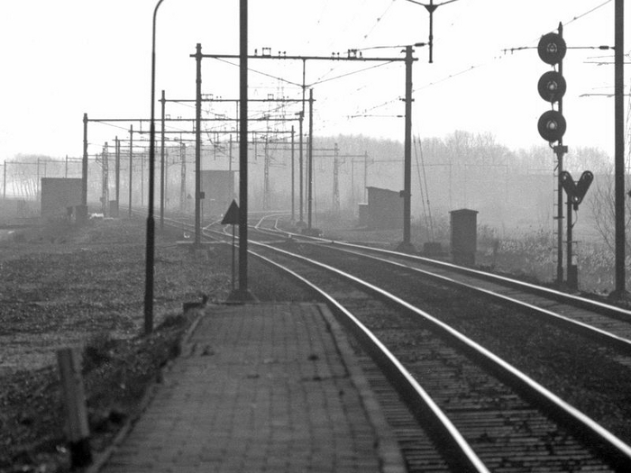 De sporen in noordelijke richting met op de achtergrond post T (links) en het emplacement in zuidelijke richting  met links de spoorlijn richting Maarssen en rechts de spoorlijn richting Woerden (rechts) d.d. 6 februari 1975.