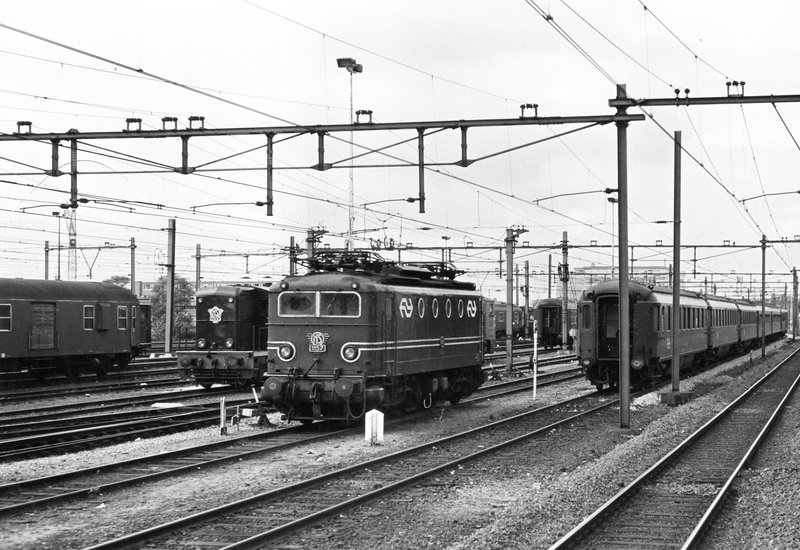 Het emplacement gezien vanaf de noordelijke hoofdsporen met ondermeer de locomotieven 1157 en 2500 (links) en in westelijke richting (rechts) d.d. 11 oktober 1975.