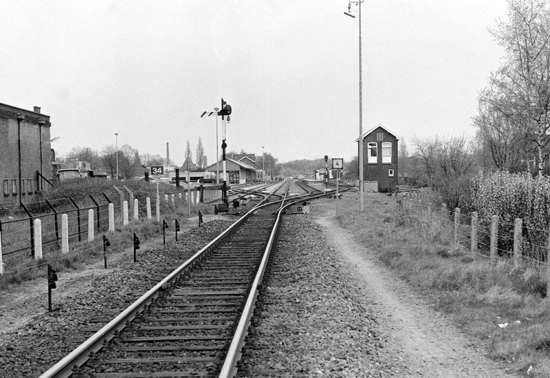 De westzijde van het emplacement met post II (links) en het spoor richting Doetinchem West met de brug over de Oude IJssel (rechts)  d.d. 24 april 1976.