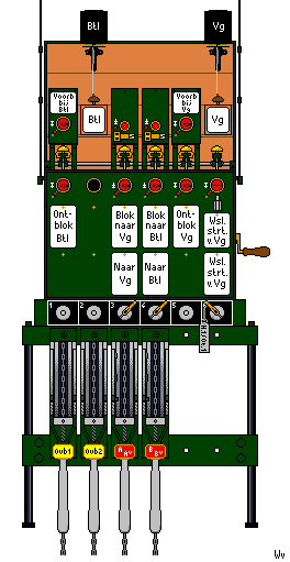 Het gelijkstroomvenster "Wsl. strt. v. Vg" in veld 6 wordt gelijk bediend met het venster "Ontbl. Vg" in veld 5 en het venster "Voorbijg. bij Vg" in veld 5b.