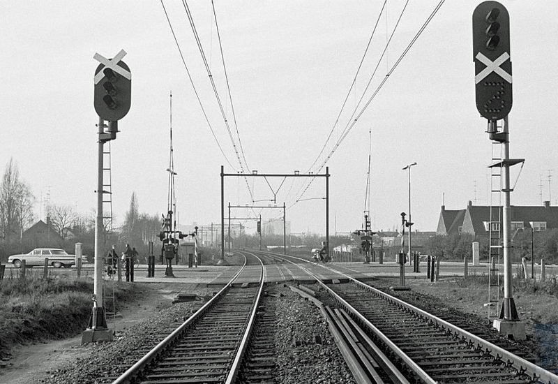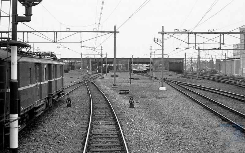 De westzijde van het emplacement gezien in oostelijke richting met de dwergseinen 32 en 34 van het stelsel 1946 d.d. 12 juli 1961.