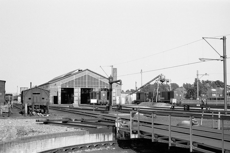Op de voorgrond de draaischijf en de waterkolom, links op het kopspoor een waterwagen en rechts de zandvulinstallatie.