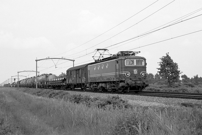 Het baanvak Eindhoven - Helmond ten oosten van Nuenen met goederentrein 4.4038 (Venlo - Rotterdam Zuid Goederenstation) bestaande uit locomotief NS 1120 en 50 wagens d.d. 11 juli 1963.