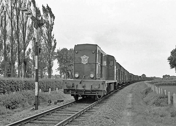 De zaterdagse buurtgoederentrein 5035 (Zwolle Rangeerstation - Emmen) bestaande uit locomotief NS 2432 (depot ZL) en 38 wagens passeert het inrijvoorsein Av d.d 16 juli 1962 (links)