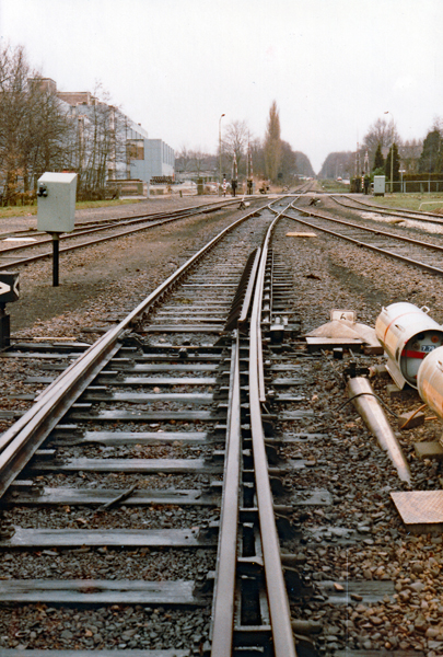 De noordzijde van het emplacement gezien in noordelijke richting met het wissel 6 en op de achtergrond de overweg in de Hunnenbaan.