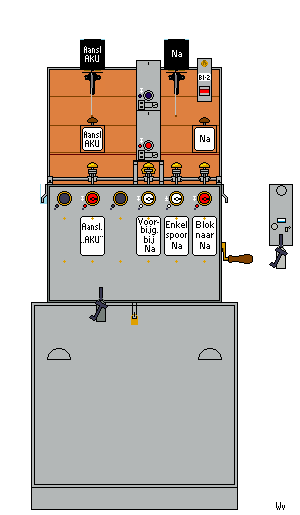 Rechtsboven is een storingsmeldkast zichtbaar voor de automatische overwegen richting Nieuw Amsterdam. De wijzer geeft aan welke overweg in storing lag. Helemaal uitgeslagen naar rechts betekende geen storing.