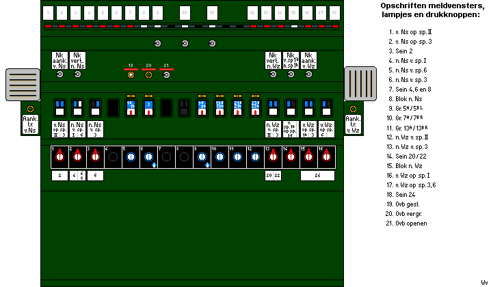 Boven in het toestel waren een aantal signaleringsvenstertjes aangebracht. Zo zaten hier de blokvenstertjes, de rijwegvensters, de seinvensters (Deze zitten normaal bij de knop maar niet bij dit toestel) en de grendelvensters met de grendelknoppen (nr 10 t/m 12 op de tekening). Dit werd vaker gedaan op toestellen met dezelfde situaties als hier met de lichtseinen.
