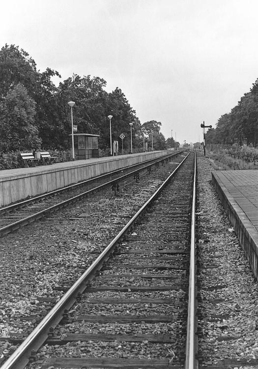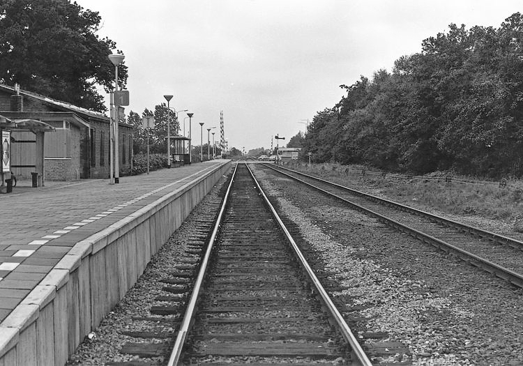 De overweg in de Rijksstraatweg gezien in zuid-oostelijke richting (links) en de wachtpost 34 (rechts) d.d. 15 augustus 1975.
