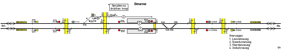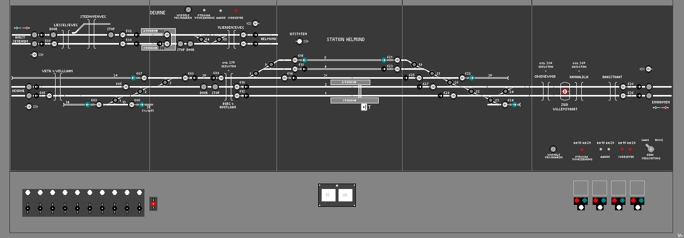 - Helmond - Deurne = Automatisch blokstelsel met lichtseinen van het stelsel 1954 ingericht voor dubbelspoorrijden met de mogelijkheid om beveiligd linkerspoor te rijden