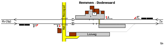 Hemmen - Dodewaard was een standaard blokpost / overwegpost combinatie. Twee blokseinen met bijbehorende voorseinen en een overweg.