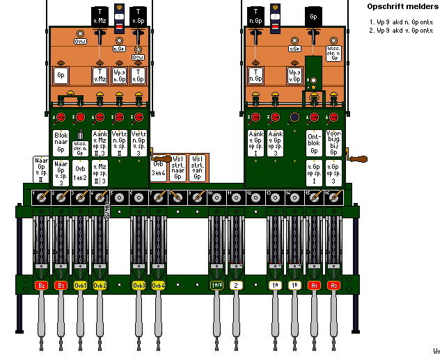 Voor vertrek of aankomst vanuit of naar Geldrop was er medewerking van wachtpost 9 nodig. Deze medewerking kon I krijgen door de knop "Wp 9 n. Gp" of "Wp 9 v. Gp"  te drukken.
