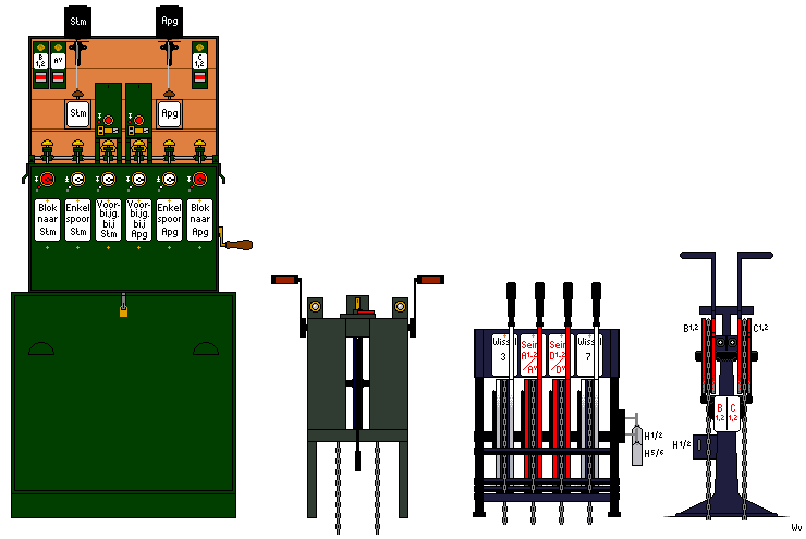 Tekening van de blokkast in post T, het windwerk voor de bediening van de overweg, de Alkmaarse Handelinrichting en de Hoge Handelinrichting.