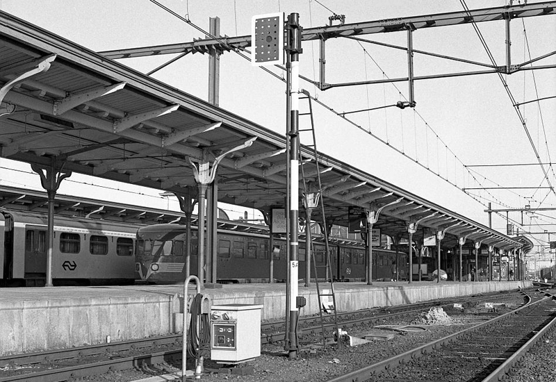 De perronseinpaal 5a/b in de stand 'stop' (links) en in de stand 'voorbijrijden toegestaan' (rechts) d.d. 23 juli 1974.