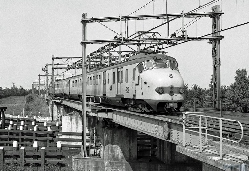 Het treinstel NS ElD4 716, met bestemming Amsterdam, kort na het vertrek uit Leeuwarden op de draaibrug over het Van Harinxmakanaal d.d. 18 augustus 1976.
