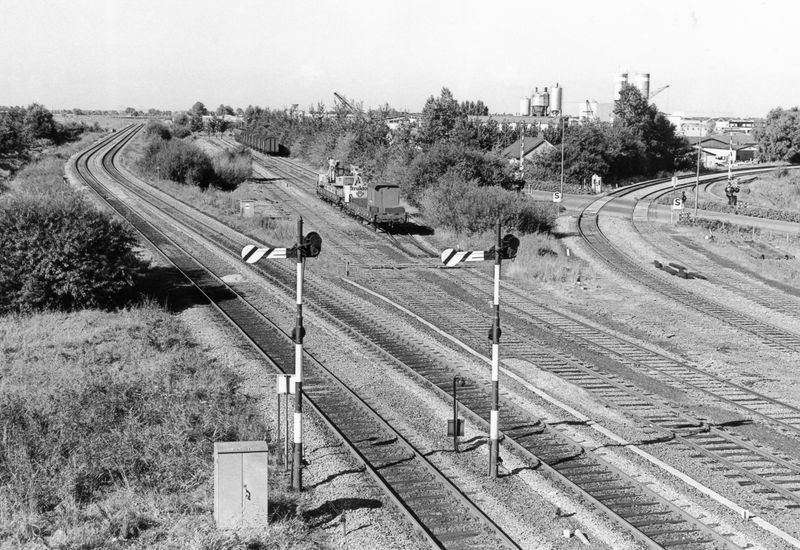 en de splitsing van de spoorlijnen naar Sneek (links) en Harlingen (rechts), ten westen van de draaibrug over het Van Harinxmakanaal d.d. 18 augustus 1976.