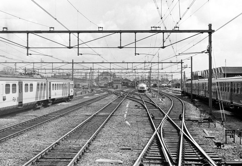 De westzijde van het emplacement met van links naar rechts de sporen richting Mantgum, Dronrijp, de sporen E3 t/m E6 en het spoor richting Stiens d.d. 16 mei 1976.
