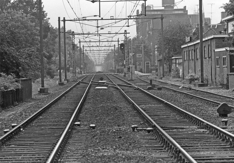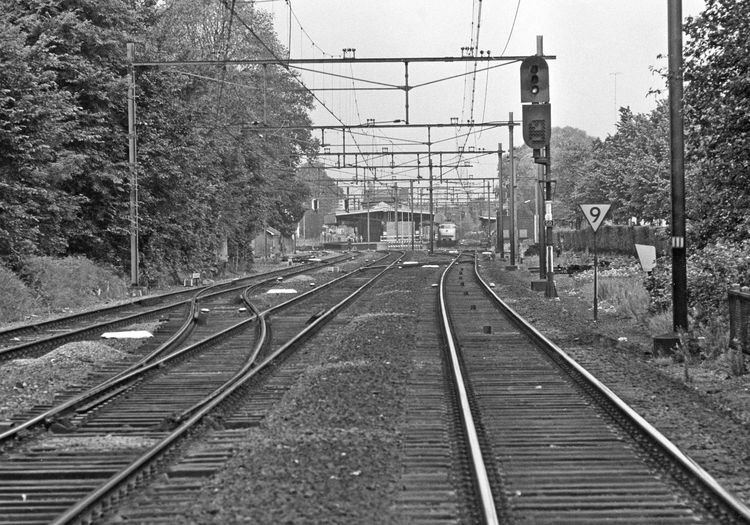 De sporen richting Hilversum (links) en het emplacement in noordelijke richting (rechts)  d.d. 26 juni 1974.