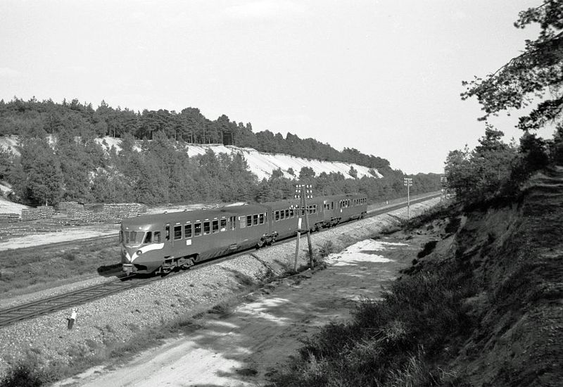 Het baanvak Zwolle - Almelo bij de niet meer bestaande zanderij bij Nijverdal met links wachtpost 21 (links)  en de westelijke aansluiting Nijverdal Zanderij met de treinstellen NS DE2 103 en 63 als trein 3948 van Almelo naar Zwolle (rechts) d.d. 5 september 1959.