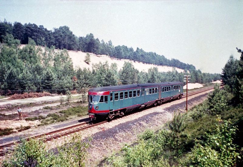 Het baanvak Zwolle - Almelo ter hoogte van de zanderij in oostelijke richting met dieseltreinstel NS DE2 68 in de blauwe kleur d.d. 10 juni 1964.