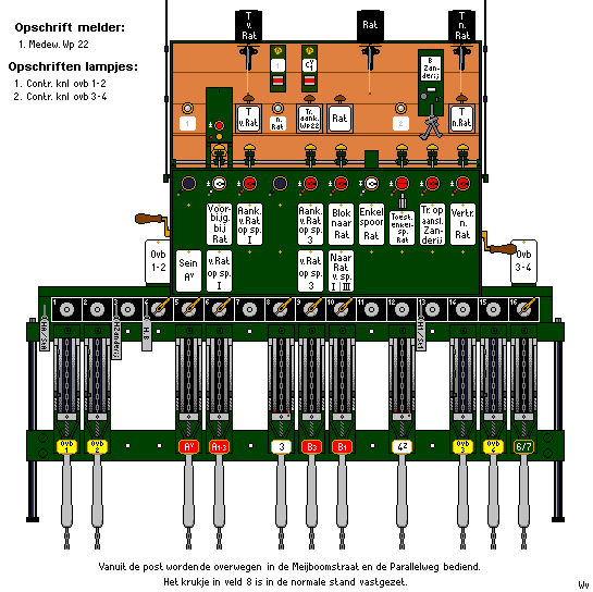 Wachtpost 22 drukt de drukknop "Tr. van Nvd I naar Raalte", waardoor de schel stopt met luiden en bij post I het venstertje "Medew. wp 22" wit wordt en de schel met langzame slag gaat luiden.