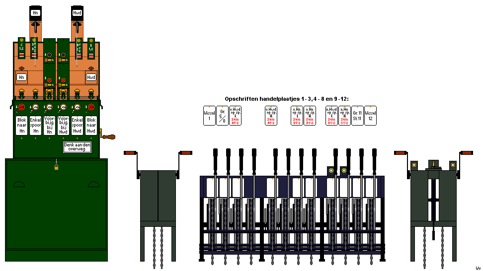 Tekening van de blokkast, de overwegwindwerken en de Alkmaarse Handelinrichting op het perron.