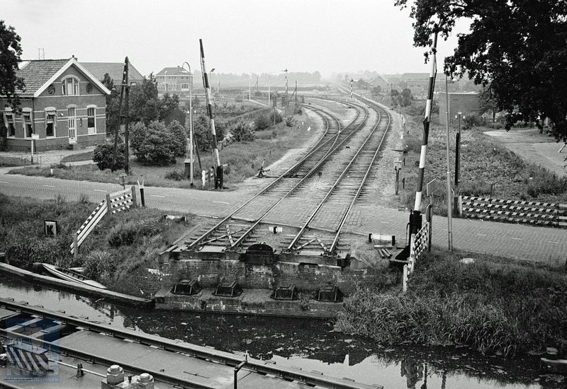 en de sporen van links naar rechts de spooraansluiting van de strookartonfabriek 'Ons Belang', het spoor richting Gasselternijveen en het spoor naar Veendam en de draaibrug over de Gasselternijveensemond gezien vanuit post I (rechts) d.d. 26 augustus 1960.