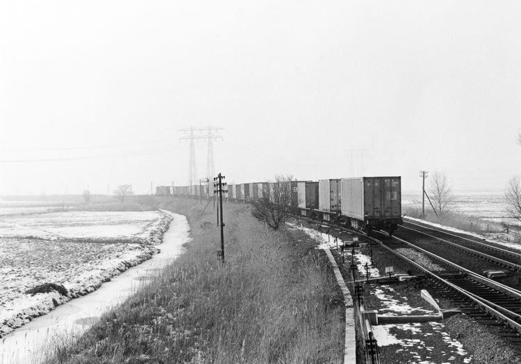 Het emplacement in westelijke richting (links)  en een goederentrein richting Onnen (rechts)  d.d. 17 februari 1978.