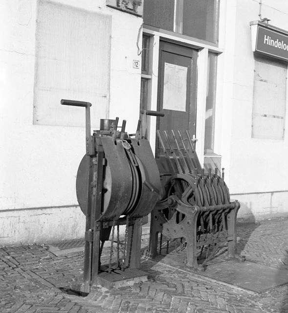 De bedieningstoestellen voor de overweg (links)  en de seinen (rechts)  te Hindeloopen.