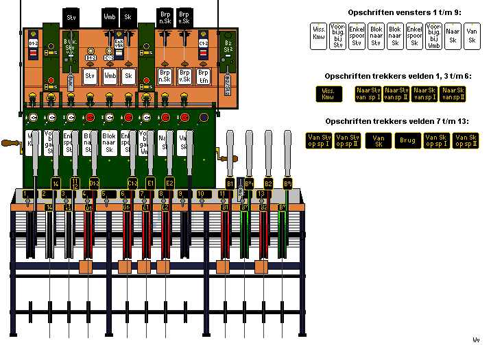| 7. | Na het vertrek van de trein trekt T de trekker in veld 10 uit en bedient de vensters 8 en 5 (worden rood) | Vrij (rood) wordt venster 2 |