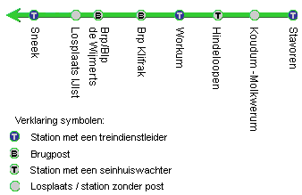 | 9. | Na binnenkomst te Workum overhandigt de machinist de sleutel "B.Wk-Stv v.v." aan de treindienstleider en wordt deze sleutel in het slot in het sleutelrelaiskastje gebracht. | |